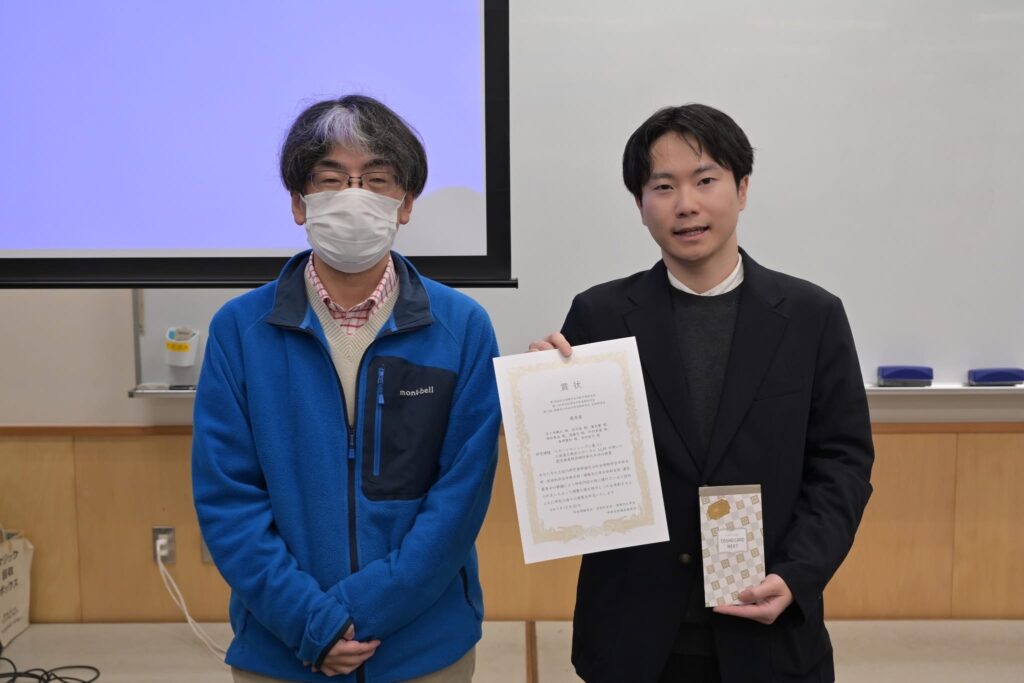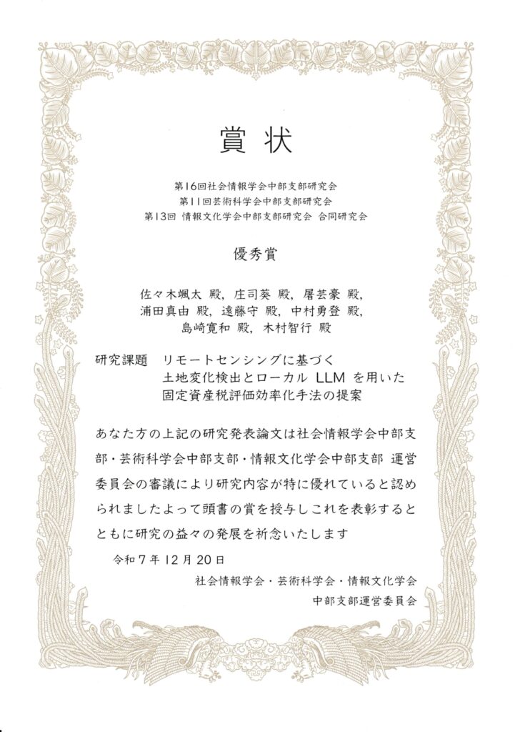 2025年度 第16回 社会情報学会中部⽀部研究会・第11回 芸術科学会中部⽀部研究会・第14回 情報⽂化学会中部⽀部研究会 合同研究会にて優秀賞を受賞しました! 2025年12月25日 MDG X Facebook 先日開催された2025年度 第16回 社会情報学会中部⽀部研究会・第11回 芸術科学会中部⽀部研究会・第14回 情報⽂化学会中部⽀部研究会 合同研究会にて、M2飯田駿佑さんとM2佐々木颯太さんが優秀賞を受賞しました。 山本教授と記念撮影する飯田さん 山本教授と記念撮影する佐々木さん 佐々木さんの賞状