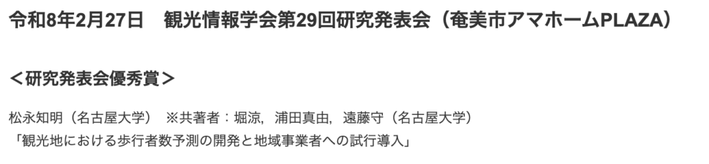 先日開催された観光情報学会第29回研究発表会にて、M1松永さんが研究発表会優秀賞を受賞しました!